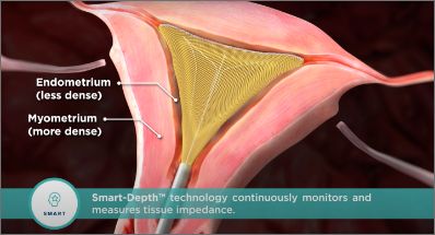 With SmartDepth™ Technology, as RF energy ablates the endometrial lining and approaches the myometrium, it will reach a higher level of impedance that it can no longer penetrate. The density of the muscle provides a physiological endpoint allowing the NovaSure controller to sense the resistance and stop the energy, completing the ablation.